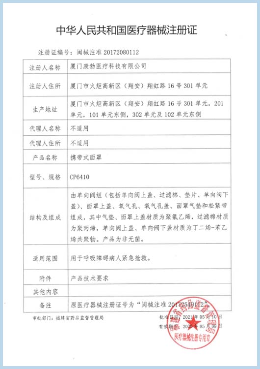 Disposable Simple Oxygen mask Registration certificate by CFDA